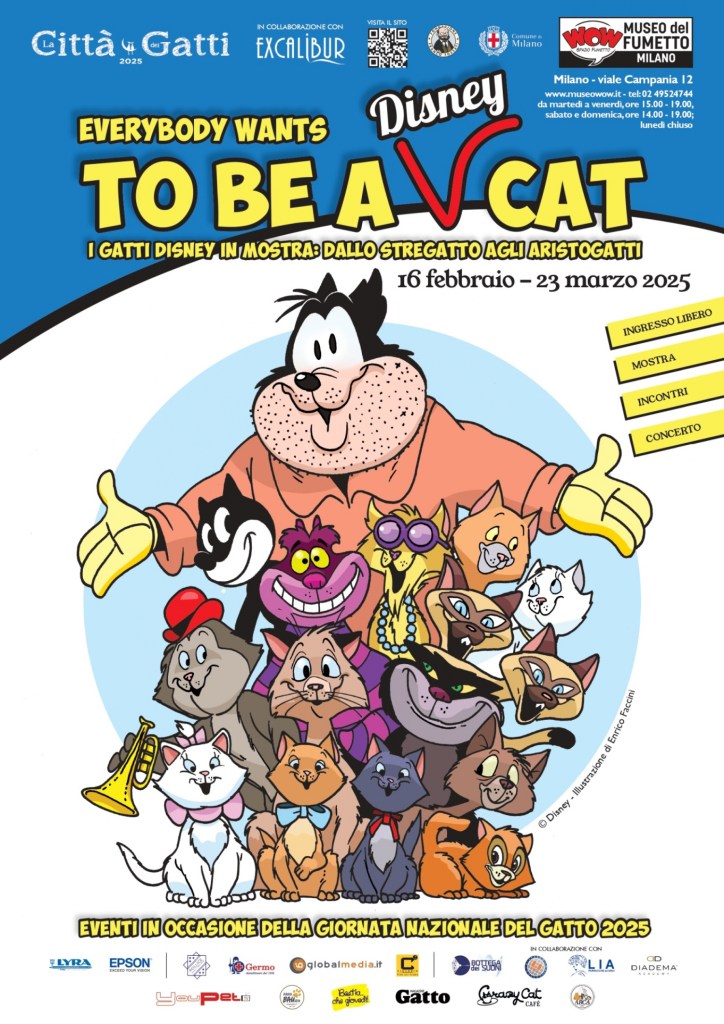16 febbraio – 23 marzo, da martedì a venerdì, ore 15-19; sabato e domenica, ore 14-19; chiuso il lunedì: Mostra Everybody Wants To Be A (Disney) Cat- WOW Spazio Fumetto – Museo del Fumetto di Milano, Viale Campania, 12. L’esposizione, a cura di Luca Bertuzzi, mutua il titolo dalla versione originale della celebre canzone de Gli Aristogatti, volendo rendere omaggio a questo straordinario mondo proponendo per la prima volta, attraverso una serie di colorati pannelli illustrativi, tutta la gallery miciosa disneyana. Il viaggio parte fin dalle origini, quando nel 1928 Disney produsse lo storico corto Steamboat Willie presentando al mondo il suo topolino Mickey Mouse e pensò subito di affiancargli un cattivone antipatico, un grosso gatto nero di nome Pietro Gambadilegno (Peg Leg Pete), un felino che resterà per sempre legato a doppio filo a Topolino come suo antagonista. Ma Gambadilegno non è propriamente il primo, in quanto il primato spetta al micio Julius creato da Disney nel 1922 per comparire insieme alla piccola Alice nella serie di cortometraggi Alice Comedies.