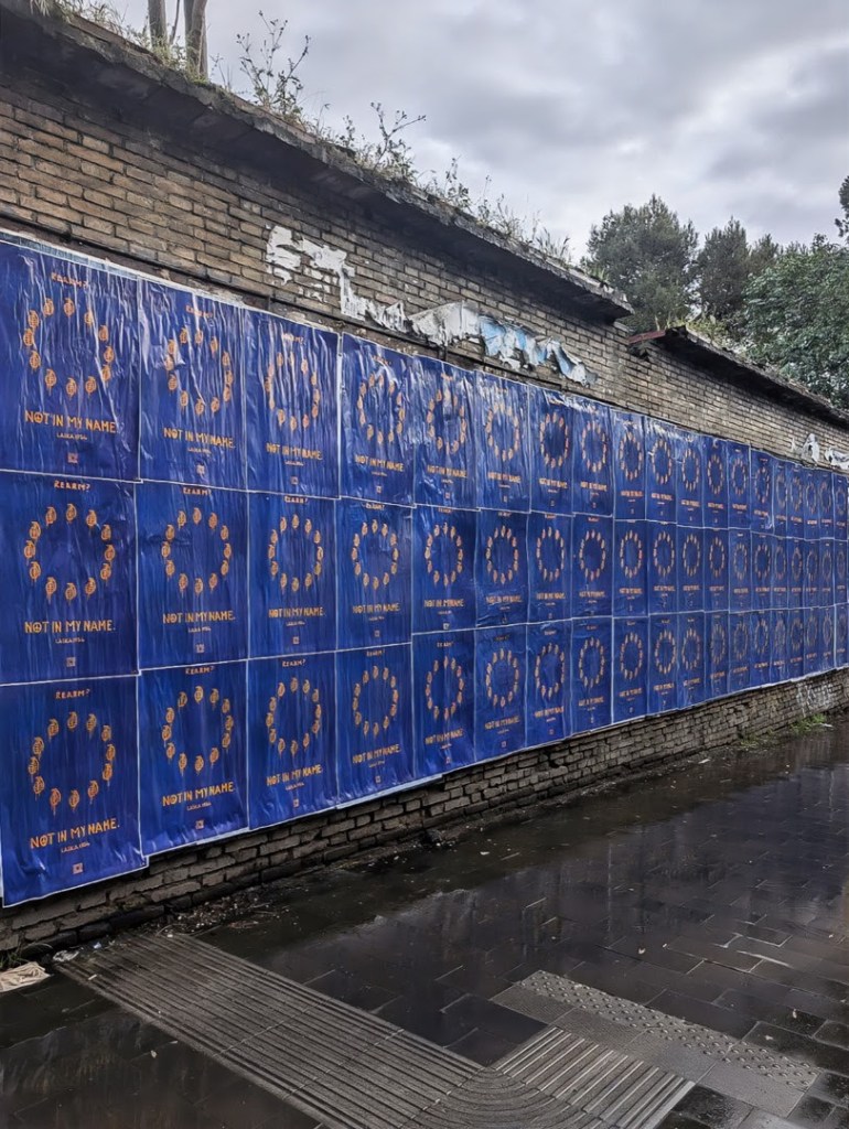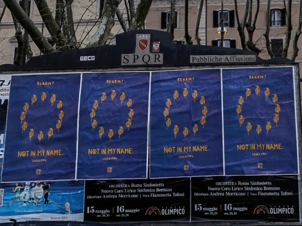 Nella mattina di oggi, venerdì 14 marzo, alla vigilia della manifestazione a difesa dell’Europa, sono apparsi per le strade di Roma centinaia di poster sparsi per tutta la città che denunciano il programma ReArm Europe, promosso da Ursula Von der Leyen e recentemente approvato dal Parlamento Europeo. Il blitz porta la firma della street artist Laika, che ha reinterpretato provocatoriamente la bandiera dell’Unione Europea, sostituendo le 12 stelle con 12 granate, un chiaro messaggio contro la crescente corsa agli armamenti. “Dopo anni di politiche di austerità che hanno messo in ginocchio lavoratori e piccoli imprenditori di tutto il continente, l’Unione Europea, sotto la guida di Ursula von der Leyen, riesce a trovare 800 miliardi per armarsi fino ai denti. Questo è un insulto a tutti noi elettori, cittadini comuni che andiamo alle urne per eleggere una classe dirigente che ci rappresenti“, commenta l’artista.