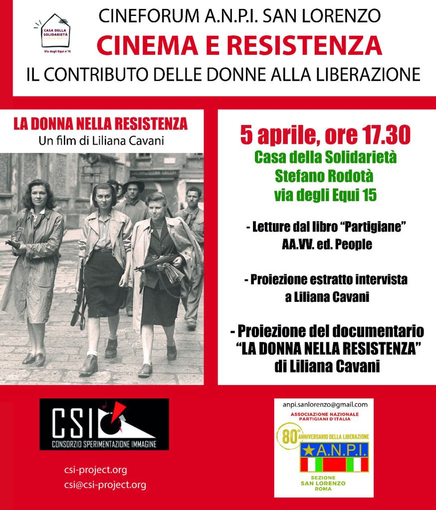Continua la rassegna Cinema e Resistenza organizzata da CSI- Consorzio Sperimentazione Immagine in collaborazione con la Sez. ANPI S. Lorenzo: domani, sabato 5 aprile, alle ore 17.30, alla Casa della Solidarietà Stefano Rodotà, via degli Equi 15, Roma, appuntamento con una nuova proiezione, dedicata al tema del contributo delle donne alla Liberazione, il documentario di Liliana Cavani La donna nella resistenza (1965), preceduta da letture tratte dal libro Partigiane (AA.VV.) e dalla proiezione di un estratto di un’intervista alla regista.