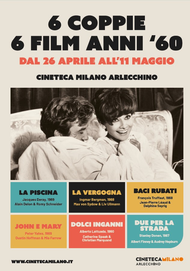 Celebrare il cinema degli anni ’60 attraverso la proiezione di sei film iconici interpretati da altrettante coppie di grandi attrici e attori che hanno appassionato, ognuna a suo modo, il pubblico di quegli anni. Con questo intento, Cineteca Milano organizzerà, dal 26 aprile all’11 maggio, al Cinema Arlecchino, la rassegna 6 coppie 6 film anni ‘60. Sarà possibile, quindi, ammirare Catherine Spaak e Christian Marquand in Dolci inganni di Alberto Lattuada (1960); Albert Finney e Audrey Hepburn in Due per la strada di Stanley Donen (1967); Max von Sydow e Liv Ullman in La vergogna di Ingmar Bergman (1968); Jean-Pierre Léaud e Delphine Seyrig in Baci rubati di François Truffaut (1968); Alain Delon e Romy Schneider in La piscina di Jacques Deray (1969); Dustin Hoffman e Mia Farrow in John e Mary di Peter Yates (1969).