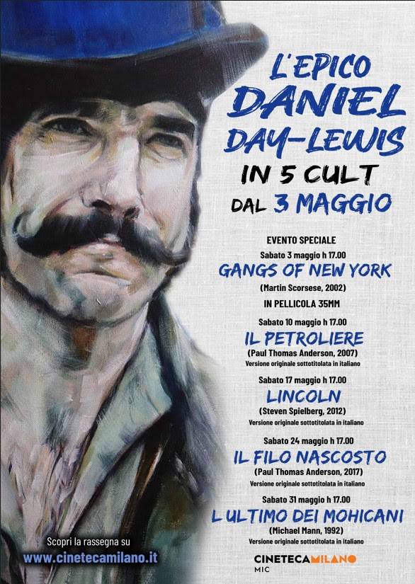 Da oggi, sabato 3, e fino a sabato 31 maggio, Cineteca Milano MIC – Museo Interattivo del Cinema, propone la rassegna L’epico Daniel Day-Lewis, cinque film per rendere omaggio ad uno dei più grandi attori degli ultimi decenni. In cartellone: L’ultimo dei mohicani (1992) di Michael Mann, Gangs of New York di Martin Scorsese (2002), Il petroliere di Paul Thomas Anderson (2007), Lincoln di Steven Spielberg (2012) e Il filo nascosto, ancora di Paul Thomas Anderson (2017), film con il quale Day-Lewis ha considerato conclusa la sua carriera cinematografica celebrata da tre Oscar come miglior interprete protagonista (unico attore ad aver raggiunto questo traguardo), conseguiti per Il mio piede sinistro (1989), Il petroliere (2007) e Lincoln (2012). Daniel Day-Lewis (1957), attore dalla solida formazione teatrale, è noto per aver sempre scelto con cura i personaggi da interpretare, infatti in quarantasei anni di carriera ha partecipato a ventuno film; è considerato anche uno dei massimi esponenti del method acting, tecnica sviluppata da Stanislavskij e Strasberg, che prevede una completa immedesimazione nel personaggio.