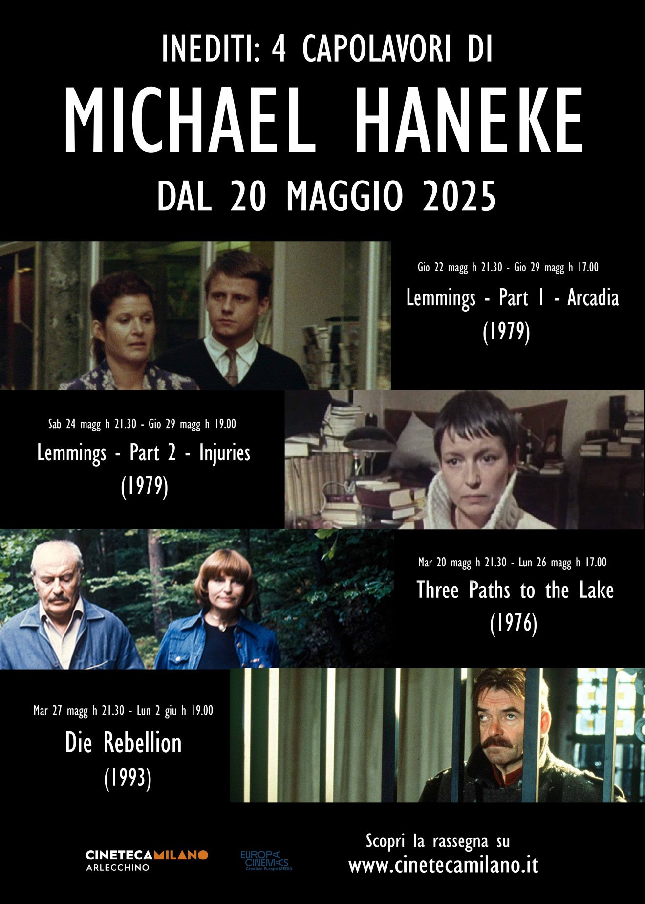 Michael Haneke, regista e sceneggiatore di film indimenticabili per la qualità cinematografica e le tematiche trattate, quali Funny Games, La pianista, Il nastro bianco, Amour, viene celebrato da Cineteca Milano con la mini rassegna Inediti: 4 capolavori di Michael Haneke, che sarà programmata in esclusiva al Cinema Arlecchino dal 20 maggio al 2 giugno. In cartellone ci sono quattro lungometraggi che il regista girò per la tv austriaca, tre dei quali prima del suo debutto sul grande schermo. Si tratta di Tre sentieri per il lago (1976), Lemmings 1 – Arcadia e Lemmings 2 – Ferite (1979) e Rebbelion (1993) che anticipano, o comunque trattano, alcuni dei temi che caratterizzeranno la cinematografia del grande regista: malinconia, senso di sconfitta personale e sociale, illusioni, delusioni e un generale disincanto verso la vita.