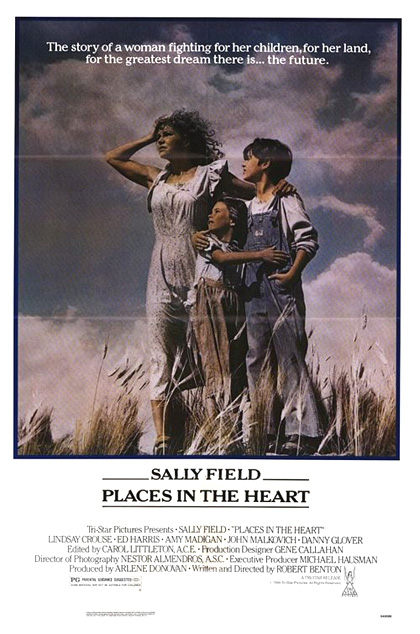 La macchina da presa si muove tra i banchi, morti e vivi, uccisori e uccisi, offensori e offesi, celebrano la Comunione, la “pace di Dio” si palesa in un’aura onirica di avvolgente speranza. Places in the Heart ebbe la sua anteprima al 35mo Festival Internazionale del Cinema di Berlino, vincendo l’ Orso d’Argento per la Miglior Regia. Conseguì poi sette candidature alla 57ma edizione degli Academy Awards, Miglior Film, Miglior Attrice Protagonista (Sally Field), Miglior Sceneggiatura Originale, Miglior Regista, Miglior Attore e Miglior Attrice non Protagonista (John Malkovich, Lindsay Crouse), Migliori Costumi (Ann Roth), ottenendo due statuette (Miglior Attrice Protagonista e Miglior Sceneggiatura Originale).