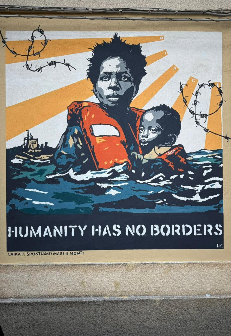 È stato inaugurato ieri sera, domenica 3 agosto, a Riace (RC), un nuovo murale dell’artista e attivista italiana Laika, a sostegno del modello di accoglienza che ha reso il borgo calabrese un simbolo internazionale di solidarietà. L’opera raffigura una madre con un bambino in mare, entrambi con giubbotti di salvataggio, avvolti da filo spinato spezzato. Sullo sfondo, il messaggio che attraversa l’intero murales: “Humanity has no borders” (“L’umanità non ha confini”). Un’immagine potente, che si inserisce nel cuore di una comunità che da anni resiste alla retorica dell’esclusione.