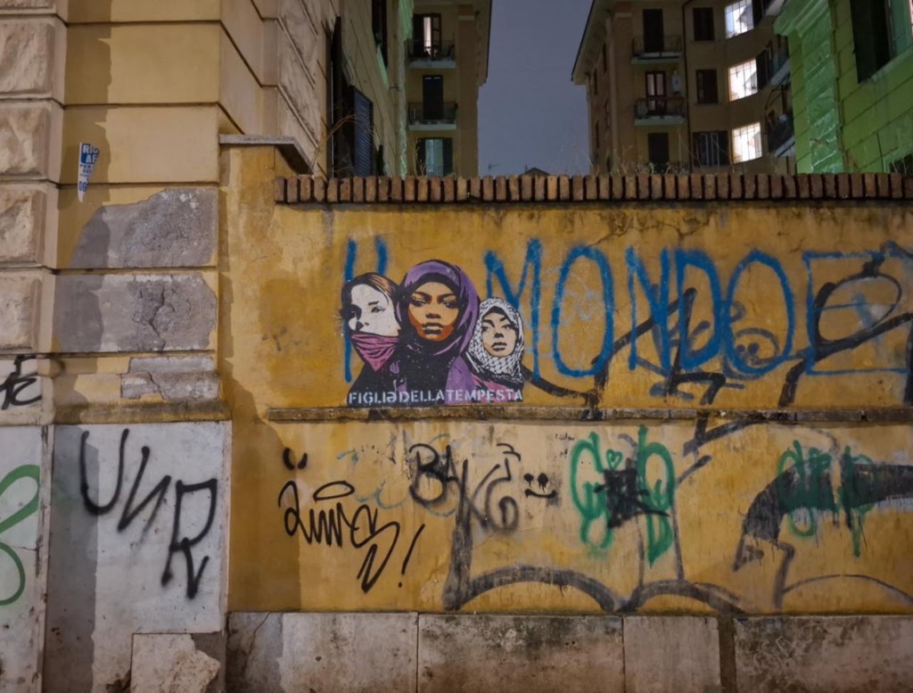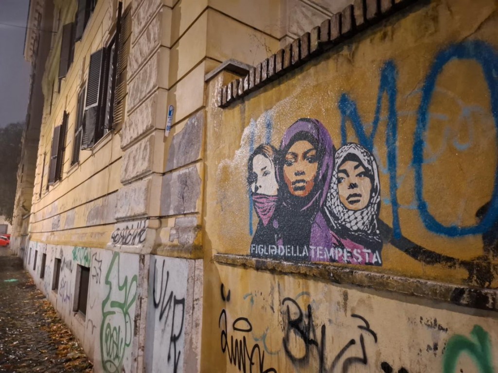 In occasione della Giornata internazionale per l’eliminazione della violenza sulle donne, nella notte tra il 24 e il 25 novembre è comparsa in via Tizii a Roma, a pochi passi dall’Università La Sapienza, la nuova opera urbana di Laika, dal titolo Figliə della Tempesta. L’intervento, ispirato al brano-inno femminista della Niña del Sud, raffigura tre donne: una sudanese, una palestinese e una europea. Negli ultimi anni Laika ha denunciato la violenza machista e patriarcale con lavori realizzati in Messico, a Ciudad Juarez, negli Stati Uniti, in Spagna e in molti altri Paesi.