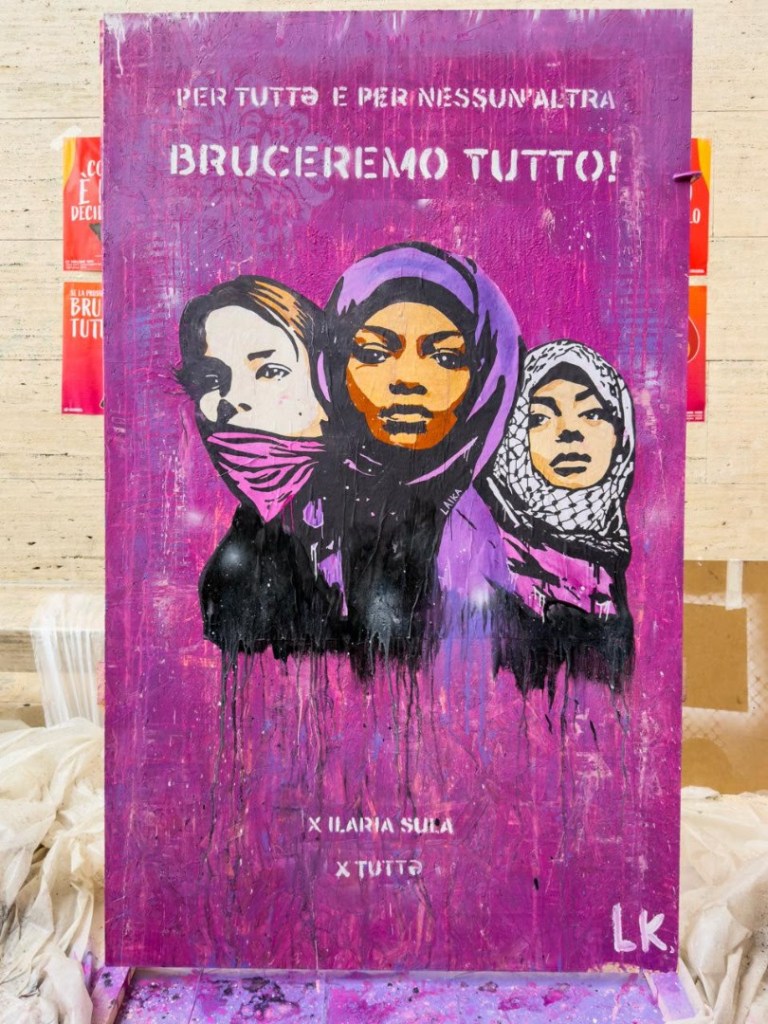 “Tornare in strada, sui muri di Roma, è un gesto politico necessario, vitale” dichiara l’artista. “In un momento terribile per la democrazia, in cui soffiano venti di guerra e avanzano gli ultranazionalismi, è fondamentale lottare con ancora più forza. La radice della deriva della nostra società è il patriarcato stesso: patriarcali sono le guerre, il colonialismo, il razzismo e i genocidi, come quello di Gaza – dove le donne uccise superano le 28.000 – e del Sudan. Sono metastasi di un cancro da estirpare alla radice”.