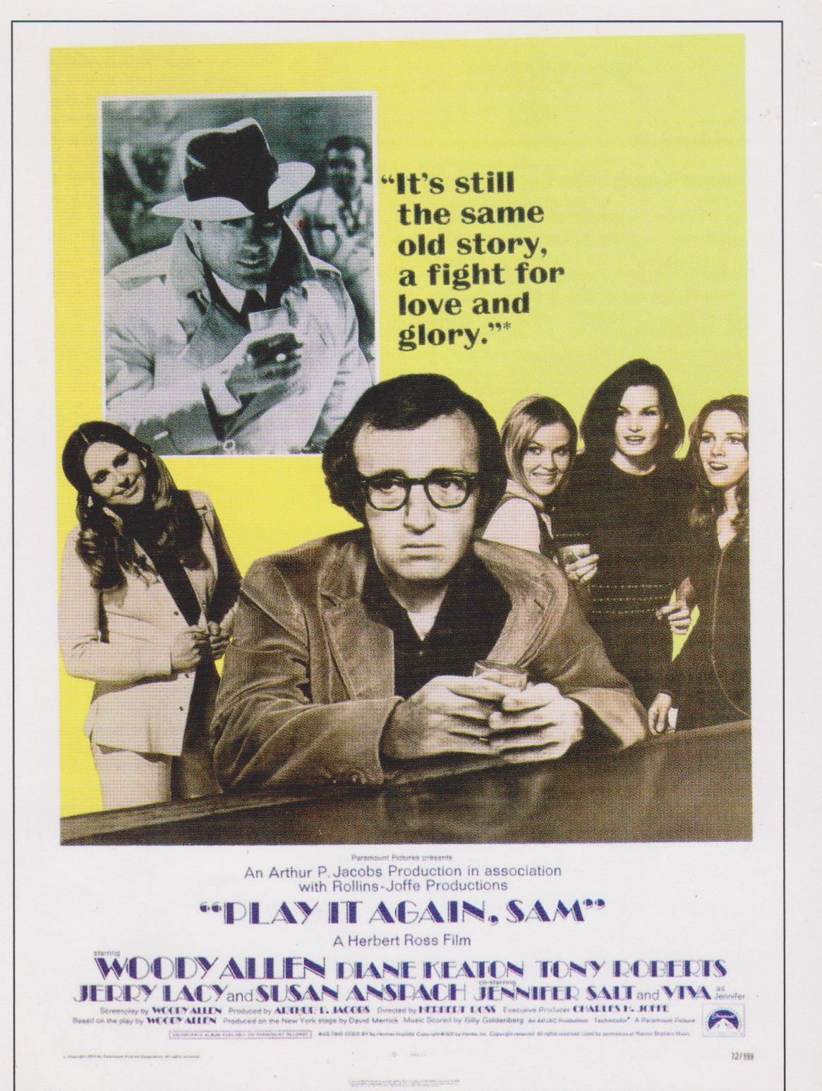 Comicità slapstick e battute fulminanti continueranno sino al 1977, quando Annie Hall, punto di svolta della sua carriera, aprirà la strada a nuovi toni riflessivi ed autoriflessivi, misti ad auto indulgenza, ponendo in essere un felice binomio fra regia, volta alla libertà creativa, ed un attento, calibrato, lavoro di scrittura. Ma già con Play It Again, Sam, 1972, regia di Herbert Ross su soggetto di Allen, derivato dalla sua omonima pièce teatrale del 1969, andarono a delinearsi i tratti essenziali della sua filmografia: il cinema, quindi l’arte, come possibile ancora di salvezza, ideale ponte di collegamento tra sogno, finzione e realtà (la scena finale, ricalcata, fotogramma per fotogramma e in ogni singola inquadratura da quella celeberrima di Casablanca), l’insicurezza nevrotica riguardo i rapporti sociali, in particolare con l’altra metà del cielo, il determinante ruolo della psicanalisi nella vita di ogni giorno, così come di una buona dose d’ironia e, soprattutto, autoironia, riprendendo quanto scritto inizialmente.
