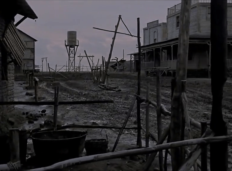 Gli interni invece ebbero la loro location negli studi della Elios, prendendo come riferimento, sempre ricorrendo alla preziosa documentazione fornita da Giusti nel citato volume, il Grafton Store presente in Shane (George Stevens, 1953). Indimenticabile l’apertura, l’incedere di Django tra fango e polvere, a piedi e non sul “tradizionale” destriero, rivelando da subito la propria natura di antieroe, mentre scorrono i titoli di testa, dalla tonalità rosso sangue, ed udiamo le note della canzone scritta da Luis Bacalov (autore della colonna sonora) insieme a Franco Migliacci, eseguita da Rocky Roberts, che faranno ritorno anche nel finale.