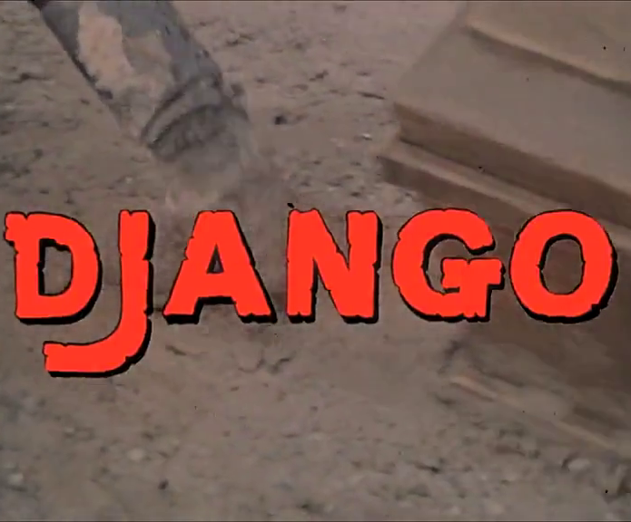 Gli interni invece ebbero la loro location negli studi della Elios, prendendo come riferimento, sempre ricorrendo alla preziosa documentazione fornita da Giusti nel citato volume, il Grafton Store presente in Shane (George Stevens, 1953). Indimenticabile l’apertura, l’incedere di Django tra fango e polvere, a piedi e non sul “tradizionale” destriero, rivelando da subito la propria natura di antieroe, mentre scorrono i titoli di testa, dalla tonalità rosso sangue, ed udiamo le note della canzone scritta da Luis Bacalov (autore della colonna sonora) insieme a Franco Migliacci, eseguita da Rocky Roberts, che faranno ritorno anche nel finale.