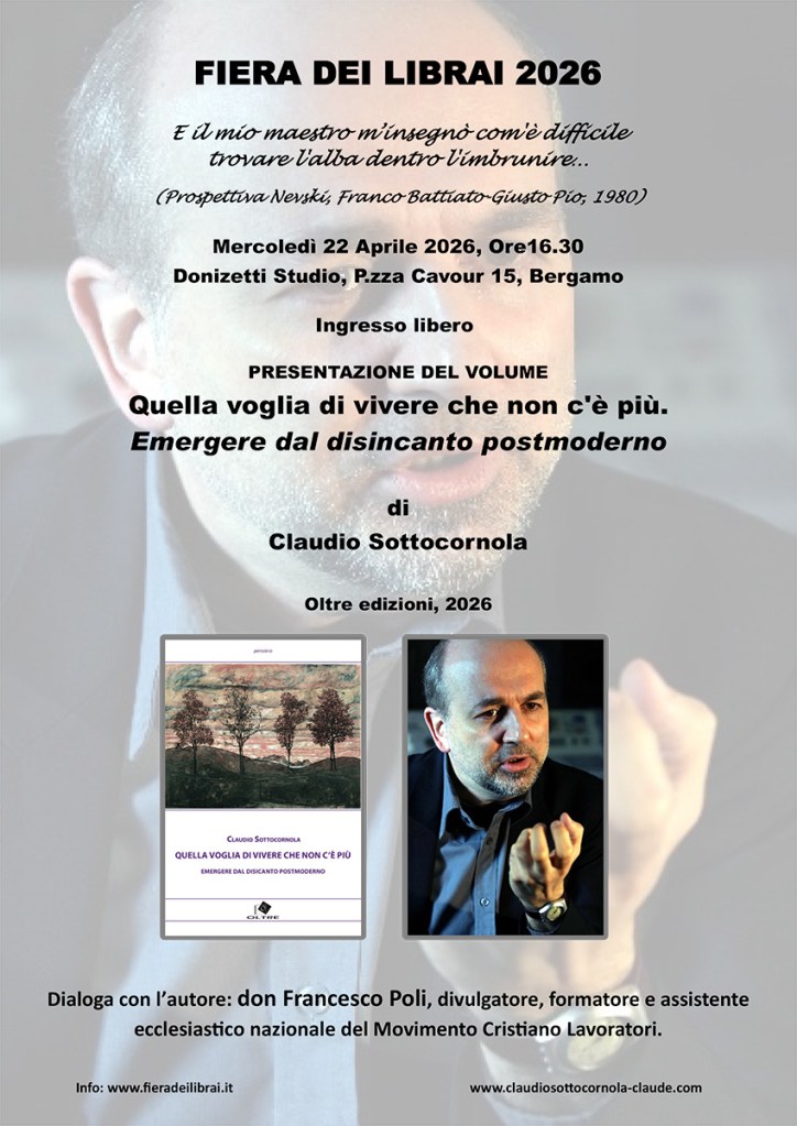 Mercoledì 22 aprile, alle ore 16.30, al Donizetti Studio di Bergamo (Piazza Cavour 15), sarà presentato, nell’ambito della Fiera dei Librai 2026, il nuovo libro del filosofo Claudio Sottocornola, Quella voglia di vivere che non c’è più. Emergere dal disincanto postmoderno (Oltre Edizioni, 2026). Dialogherà con l’autore don Francesco Poli, divulgatore, formatore e assistente ecclesiastico nazionale del Movimento Cristiano Lavoratori. Di seguito, la mia recensione.