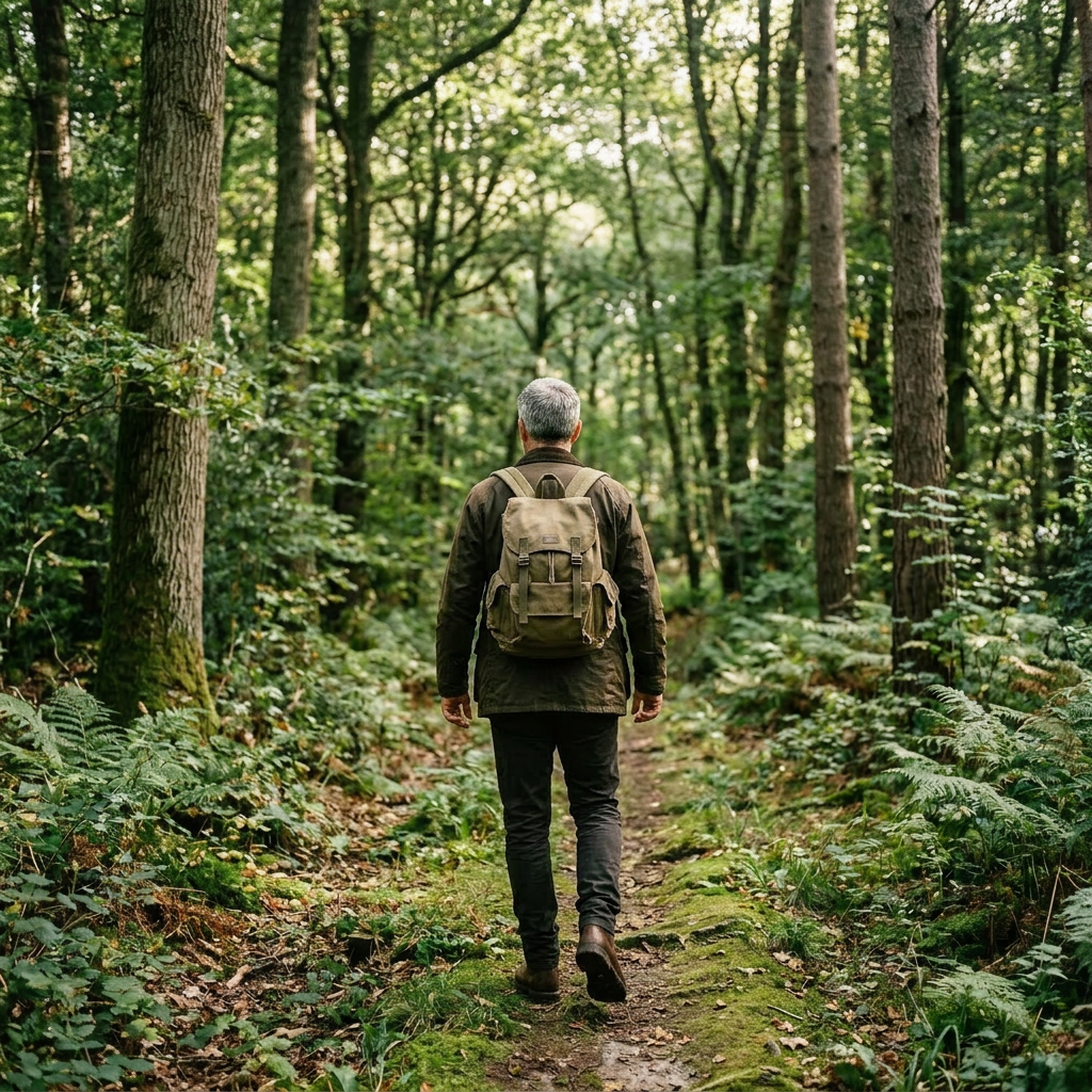 Middle-aged man with backpack standing on forest trail looking ahead