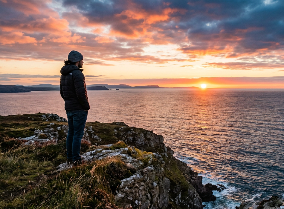 Person standing on rocky cliffs overlooking the ocean at sunset