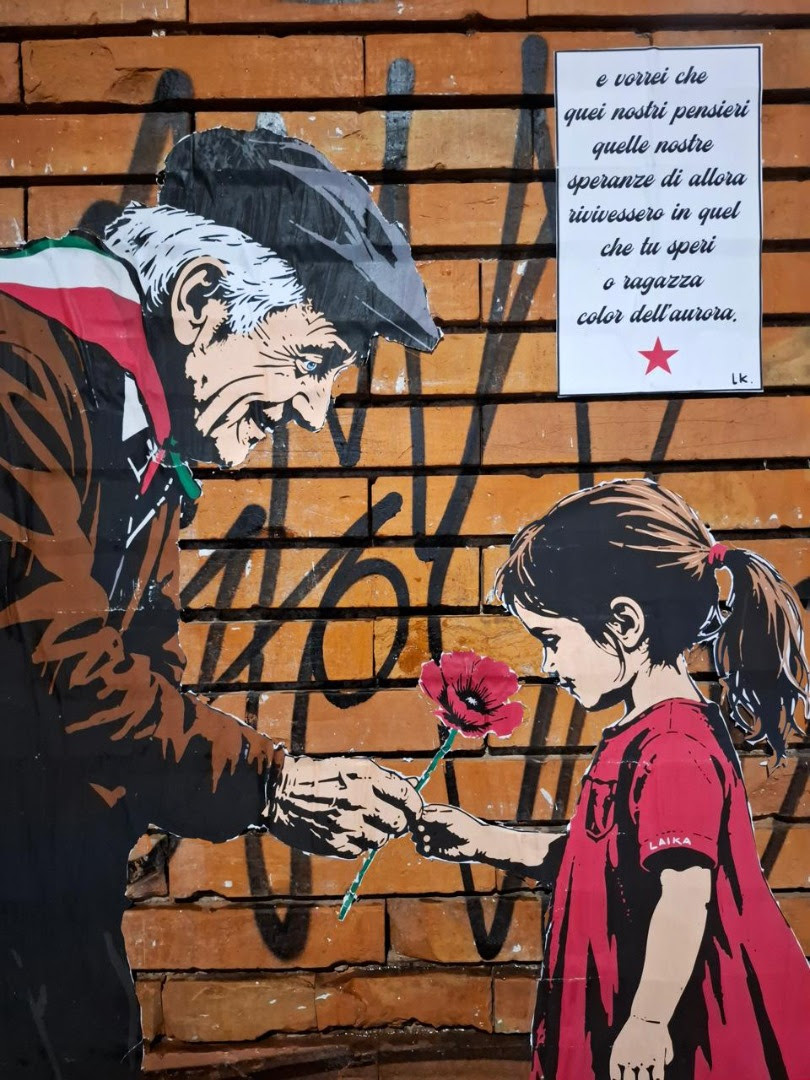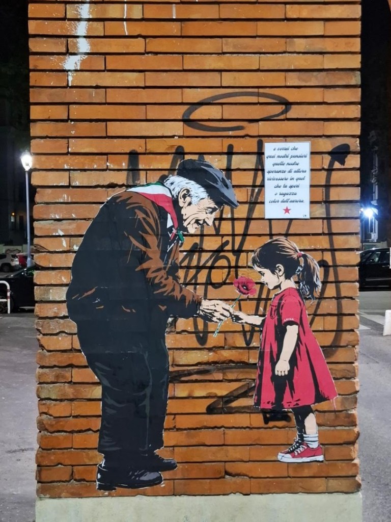 In occasione della Festa della Liberazione dal nazifascismo, la street artist Laika firma una nuova opera apparsa nella notte tra il 24 e il 25 aprile nel quartiere della Garbatella, a Roma, luogo simbolo della Resistenza capitolina. Il lavoro, realizzato in collaborazione con i collettivi Join the Resistance e Artivismo, si intitola Senza memoria non c’è futuro e ritrae un nonno partigiano che regala un fiore rosso alla sua nipotina. Il poster è accompagnato da un estratto di Oltre il Ponte, brano scritto da Italo Calvino nel 1959: “E vorrei che quei nostri pensieri, quelle nostre speranze di allora rivivessero in quel che tu speri, o ragazza color dell’aurora”.